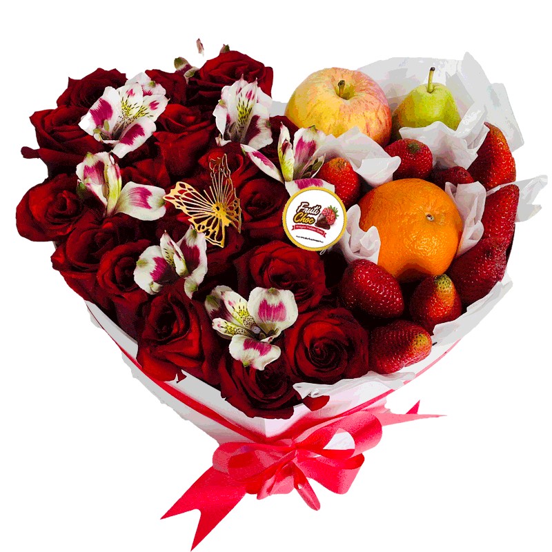 Cajita base de corazón, 18 a 20 Flores, manza, naranja americana, pera, frutilla , follaje