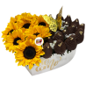 7 a 8 girasoles + 1 Ferrero corazón + peluche de 25 cm de alto + follaje + empaque, lazo pomposo y tarjeta con tu mensaje impreso.